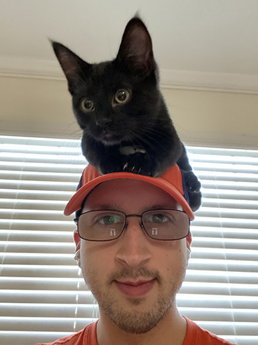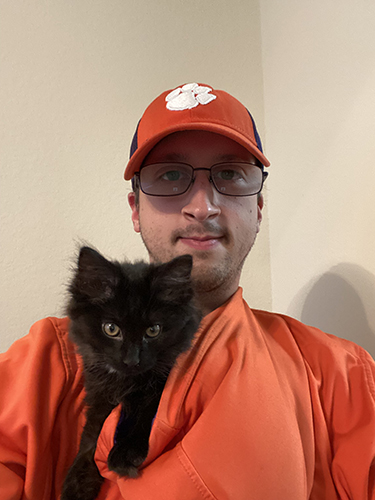 Kaleb enjoys hiking, reading, and playing video games in his free time. During the Fall, he enjoys watching Clemson and Tennessee football games with friends and family. He also has two black cats, Salem and Sabrina, who were part of a litter found outside of AMS in 2021. These two are adorable, and you can follow their adventures on Instagram @frizzykitties!